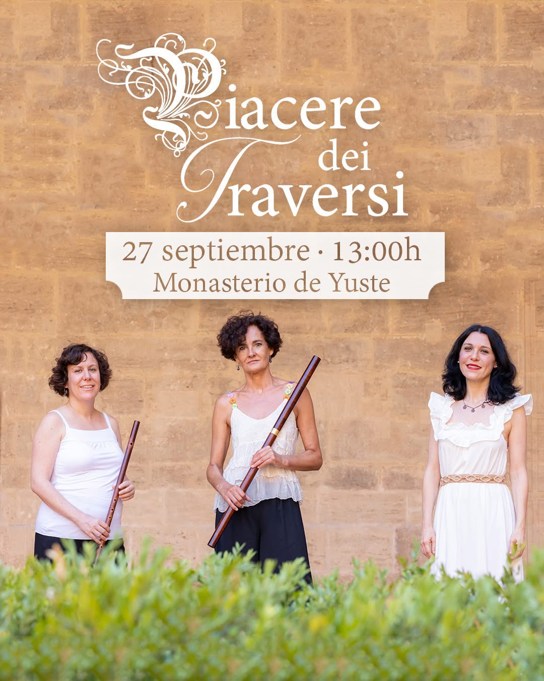 EL SÁBADO, 27 DE SEPTIEMBRE, a las 13:00 horas, en la Iglesia del Real Monasterio de Yuste, magnífico concierto del grupo PIACERE DEI TRAVERSI, dentro del Ciclo "Música en Yuste", que organiza Patrimonio Nacional junto con la Fundación Academia Europea e Iberoamericana de Yuste. La entrada es gratuita hasta completar aforo.