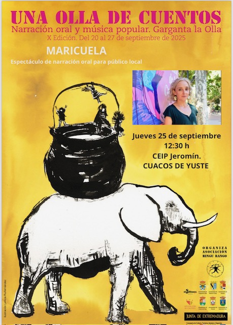 Desde la Alcaldía de Cuacos de Yuste se recuerda que este próximo jueves, 25 de septiembre, a las 12:30 horas, tendrá lugar en el Colegio "Jeromín" un espectáculo de narración oral abierto a todo el público, protagonizado por MARICUELA, dentro de la X edición del Certamen "Una Olla de Cuentos", en el que participa el Ayuntamiento de Cuacos de Yuste.