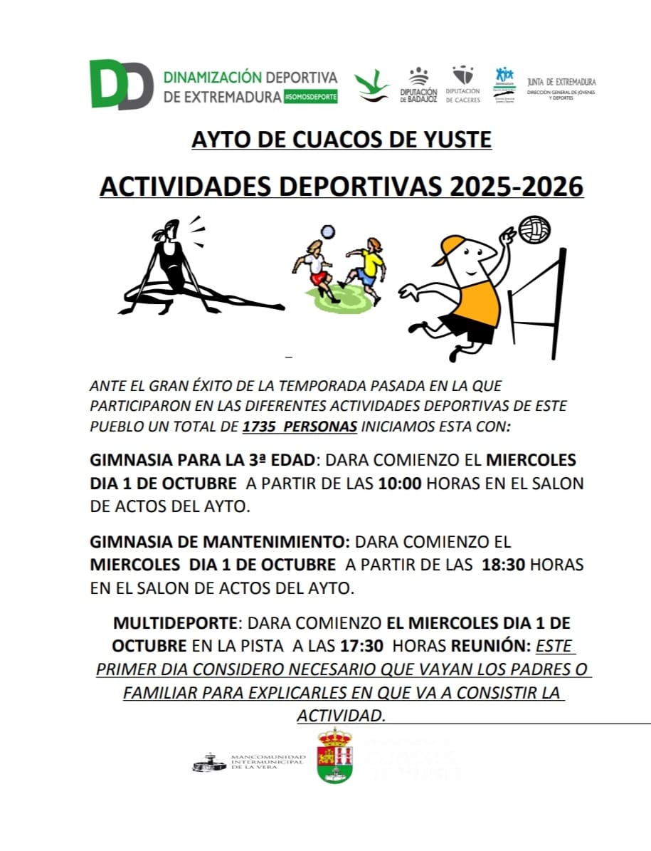 Desde la Alcaldía de Cuacos de Yuste se informa que junto con el Dinamizador Deportivo de la Mancomunidad Intermunicipal de la Vera asignado a nuestro pueblo, comenzamos nueva temporada de actividades deportivas para el curso 2025-2026, con el siguiente calendario: