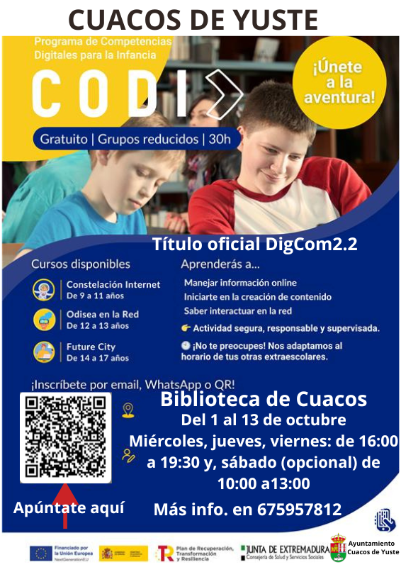 Desde la Alcaldía de Cuacos de Yuste se informa que aún sigue abierto el plazo de inscripción a los cursos de competencias digitales que se impartirán en la Biblioteca Municipal de nuestro pueblo desde el 1 al 13 de octubre, al objeto de poder obtener el Título Oficial DigCom2.2.